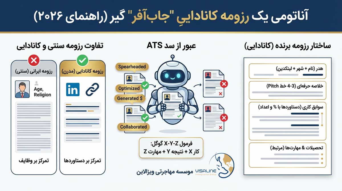 در بازار کار به شدت رقابتی کانادا، شما فقط ۶ ثانیه فرصت دارید تا توجه کارفرما را جلب کنید. از آن ترسناکتر، قبل از اینکه رزومه شما به دست انسان برسد، باید از سد رباتهای سختگیری به نام ATS عبور کند. ما در موسسه مهاجرتی ویزالاین، بارها شاهد بودهایم که چگونه یک رزومه استاندارد، سرنوشت یک پرونده مهاجرتی را تغییر داده است. در این راهنمای جامع، نه تنها اصول نگارش رزومه کانادایی را یاد میگیرید، بلکه لیست کلمات کلیدی جادویی برای عبور از فیلترهای ATS را نیز دریافت خواهید کرد.